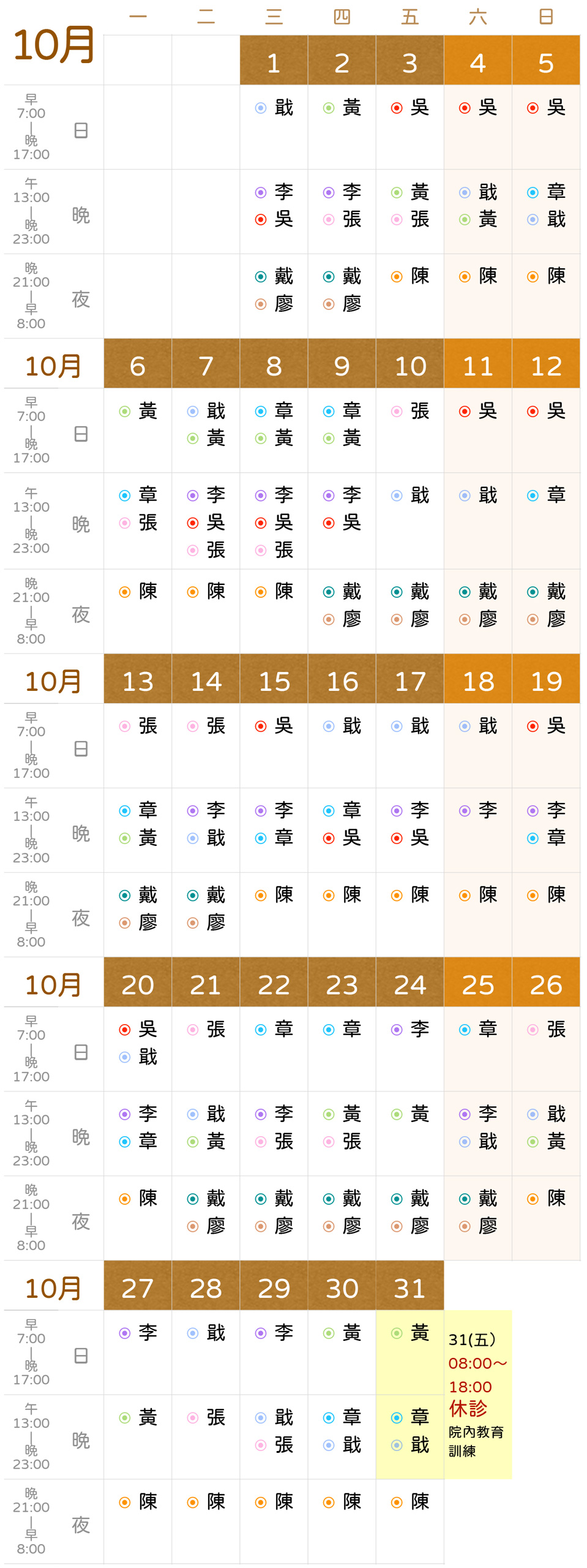 *10月31日(五)因院內教育訓練,上午8:00至下午18:00休診,敬請見諒! 本月醫師值班表 掛號前小提醒 門診皆現場掛號候診 就診前可來電詢問現場狀況: 02-85218710 掛號費用 日間09:00~21:00: 初診掛號 200 元/複診掛號 50 元 夜間21:00~09:00: 急診掛號 1000 元 醫療團隊 李佳勳醫師 章倍瑜醫師 吳柔穎醫師 戢皓翰醫師 黃建智醫師 張卉宜醫師 陳靜伊醫師 戴言庭醫師 廖祐晟醫師